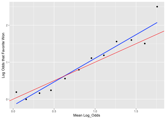 The Adjusted Log Odds coefficient is clearly positive. It is also almost certainly greater than 1, which means the slope is steeper that what you would expect if the Fight Odds perfectly tracked the Probability of the Favorite Winning. Indeed, this steep slope along with the negative intercept manifests in the clear trend whereby the Adjusted Odds overestimate mild Favorites but underestimate large ones.
